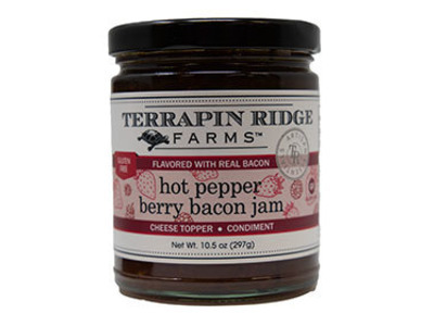 Sweet raspberries and strawberries are mixed with roasted red peppers and real bacon to create the perfect blend of sweet, spicy and smoky. This mouthwatering jam pairs splendidly with cheeses. Use as a marinade and finishing sauce for pork or poultry. For an incredible and easy appetizer, mix with cream cheese and serve with crackers. All natural and gluten free.