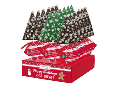Place an order for our Chocolate Covered Rice Krispie Treat Tree with Snowflake Confetti. Festive and perfect for the holidays and comes in a display with 18 treats.