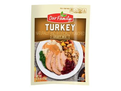 Introducing the Turkey Gravy Mix 24/.75oz from Our Family, a convenient and delicious addition to your store's pantry section. This high-quality gravy mix is crafted to deliver a rich, savory flavor that perfectly complements turkey and other poultry dishes. Each packet contains a blend of carefully selected seasonings and ingredients, ensuring a consistent and mouthwatering gravy every time.